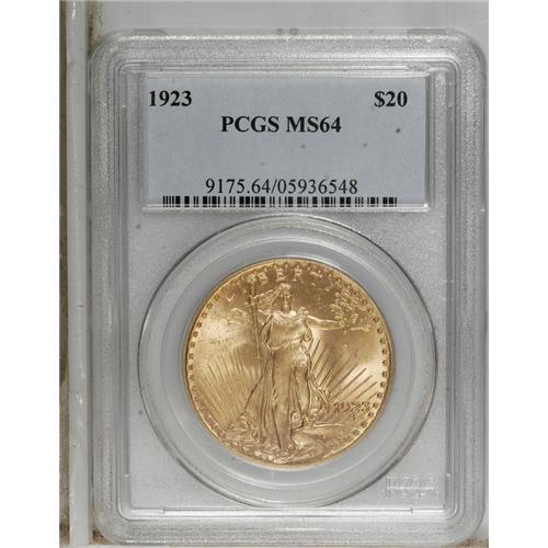 <B>1923 $20 MS64 PCGS.</B></I> Rich rose-gold color and frosty luster are present on both sides of this beauty. It is sharply struck with strong details, including the buildings along the lower left obverse border.<BR><BR><b>Shipping:</b> Coins & Currency (<a target="_blank" href="http://www.heritageauctions.com/common/shipping.php">view shipping information</a>)