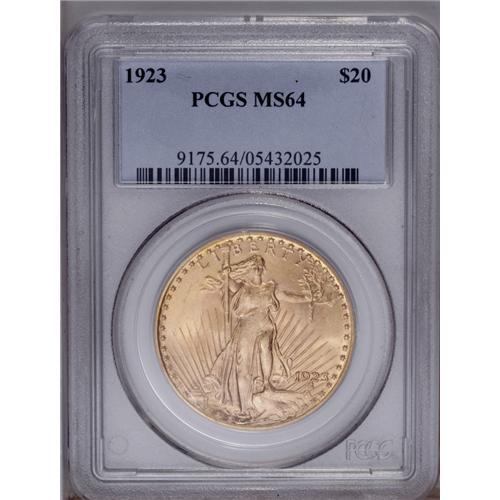 <B>1923 $20 MS64 PCGS.</B></I> Straw-gold, brilliant surfaces with scintillating luster complement a bold strike. Perusal with a loupe reveals a couple of scrapes on Liberty's head and torso, and through the eagle's upper wing feathers. Despite the minor abrasions, the appearance is superior overall.