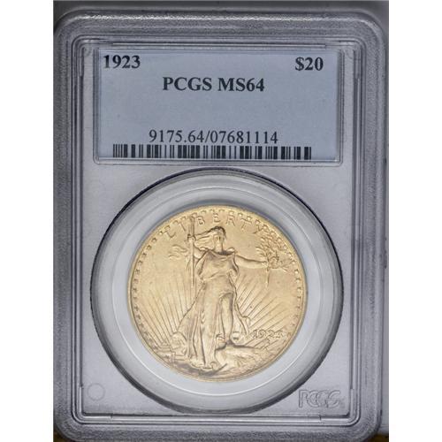 <B>1923<$20> MS64 PCGS.</B></I> This issue is an example of how meaningless the mintage figures are for Saint-Gaudens double eagles: the mintage of slightly more than a half-million for the 1923, a readily obtainable coin in Mint State, is about the same as the 1921, a classic rarity (of which most were melted) with few specimens known in Mint State. This example has attractive copper-golden color, frosty surfaces, and a pleasing strike with few mentionable abrasions.
