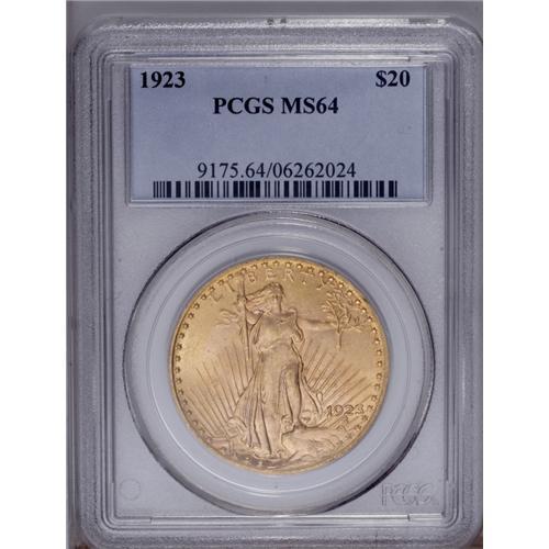 <B>1923 $20 MS64 PCGS.</B></I> This issue is an example of how meaningless the mintage figures are for Saint-Gaudens double eagles: the mintage of slightly more than a half-million for the 1923, a readily obtainable coin in Mint State, is about the same as the 1921, a classic rarity (of which most were melted) with few specimens known in Mint State. This example has attractive copper-golden color, frosty surfaces, and a pleasing strike with few mentionable abrasions.