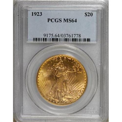 <B>1923 $20 MS64 PCGS.</B></I> PCGS Population (2559/286). NGC Census: (1846/119). Mintage: 566,000. Numismedia Wsl. Price for NGC/PCGS coin in MS64: $920. (#9175)<BR><BR><B>Coin Engraver:</B> Augustus Saint-Gaudens<BR><BR><b>Shipping:</b> Coins & Currency (<a target="_blank" href="http://www.heritageauctions.com/common/shipping.php">view shipping information</a>\)