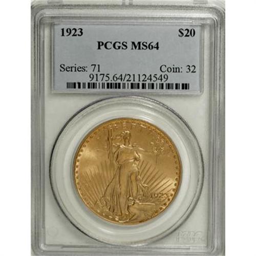 <B>1923 $20 MS64 PCGS.</B></I> PCGS Population (2732/309). NGC Census: (1862/122). Mintage: 566,000. Numismedia Wsl. Price for NGC/PCGS coin in MS64: $920. (#9175)<BR><BR><B>Coin Engraver:</B> Augustus Saint-Gaudens<BR><BR><b>Shipping:</b> Coins & Currency (<a target="_blank" href="http://www.heritageauctions.com/common/shipping.php">view shipping information</a>)