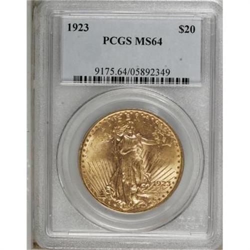 <B>1923 $20 MS64 PCGS.</B></I> PCGS Population (2778/316). NGC Census: (1897/116). Mintage: 566,000. Numismedia Wsl. Price for NGC/PCGS coin in MS64: $920. (#9175)<BR><BR><B>Coin Engraver:</B> Augustus Saint-Gaudens<BR><BR><b>Shipping:</b> Coins & Currency (<a target="_blank" href="http://www.heritageauctions.com/common/shipping.php">view shipping information</a>)