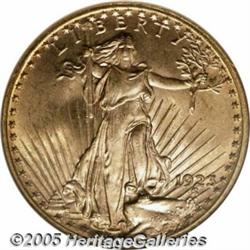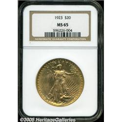 <B>1923 $20 MS65 NGC.</B></I> This date is generally considered to be one of the common dates in the series, but it certainly does not deserve the same common date status as the next few years of coinage from Philadelphia. It is fully brilliant with pinkish-gold color and excellent eye appeal. The surfaces have only a few tiny abrasions. Just one finer example has been certified by PCGS and none by NGC. Population: 77 in 65, 0 finer (2/05).