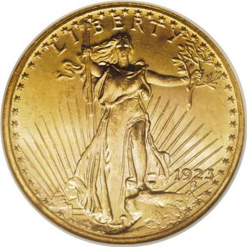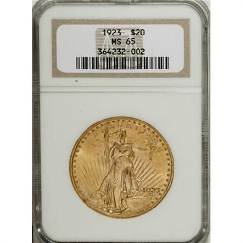 <B>1923 $20 MS65 NGC.</B></I> While the 1923 double eagle is not a particularly elusive piece through Select grades, Gem examples are surprisingly difficult to acquire. This crisply struck, well-preserved example offers strong luster and excellent overall eye appeal. A noteworthy piece, tied for the finest certified by NGC (6/07).<BR><I>From The DAX Collection.</B></I><BR><BR><B>Coin Engraver:</B> Augustus Saint-Gaudens<BR><BR><b>Shipping:</b> Coins & Currency (<a target="_blank" href="http://www.heritageauctions.com/common/shipping.php">view shipping information</a>\)