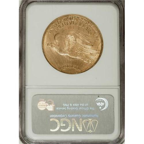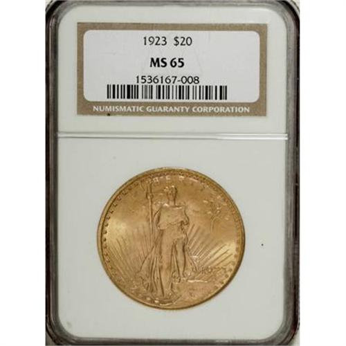 <B>1923 $20 MS65 NGC.</B></I> The 1923, like the 1927 and similar dates, had a high survival rate in overseas hoards. Yet only a small fraction of the original mintage survives in Gem today. The present example offers attractive luster and largely mark-free yellow-gold surfaces with glints of apricot. Tied for the finest certified by NGC (7/07).<BR><BR><B>Coin Engraver:</B> Augustus Saint-Gaudens<BR><BR><b>Shipping:</b> Coins & Currency (<a target="_blank" href="http://www.heritageauctions.com/common/shipping.php">view shipping information</a>)