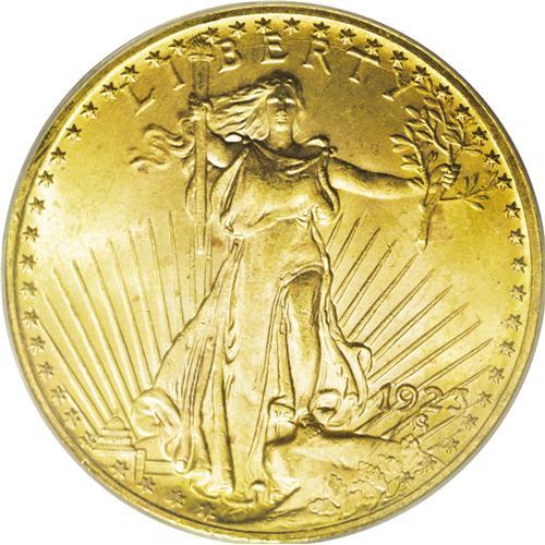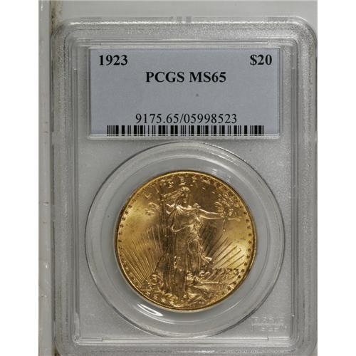 <B>1923 $20 MS65 PCGS.</B></I> A handsome golden-tan Gem with vivacious luster and an attentive strike. Impressively smooth, although the reverse has a few red-wine alloy spots. Interesting for a heavy die crack through LIBERTY. PCGS and NGC combined have certified only three pieces finer.<BR><BR><b>Shipping:</b> Coin/Currency (<a target="_blank" href="http://www.heritageauctions.com/common/shipping.php">view shipping information</a>)