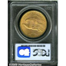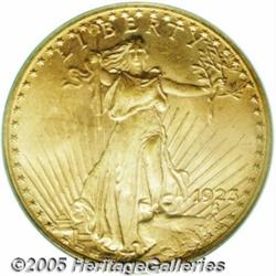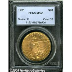 <B>1923 $20 MS65 PCGS.</B></I> Despite a limited original mintage of 566,000 pieces, the 1923 has long been recognized as one of the more common Saint-Gaudens Double Eagles. Such an assessment is misplaced for coins that grade finer than MS63. Near-Gem survivors are scarce, and those that grade MS65 or finer are downright rare. This is a beautiful Gem with rich reddish-gold color evenly distributed over both sides. The otherwise sharp strike wanes ever so slightly at the lower left obverse border--a not uncommon feature for the issue--and rich mint frost shimmers as the surfaces rotate under the light. Free of all but a few small, well scattered abrasions. Population: 82 in 65, 1 finer (1/05).