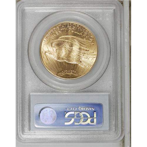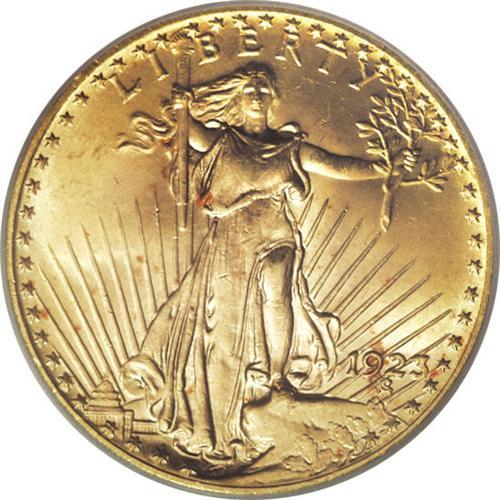 <B>1923 $20 MS65 PCGS.</B></I> The 1923 double eagle is a common date, the result of many surviving in overseas hoards. Several thousand coins have been seen by PCGS and NGC through near-Gem, and almost 400 MS65 examples have been graded (3/07). The 1923 is virtually unobtainable any finer. Bright peach-gold luster adorns both sides of this sharply struck Gem. A few light obverse alloy spots are noted, and some minute marks on each side preclude a higher grade.<BR><BR><b>Shipping:</b> Coins & Currency (<a target="_blank" href="http://www.heritageauctions.com/common/shipping.php">view shipping information</a>)