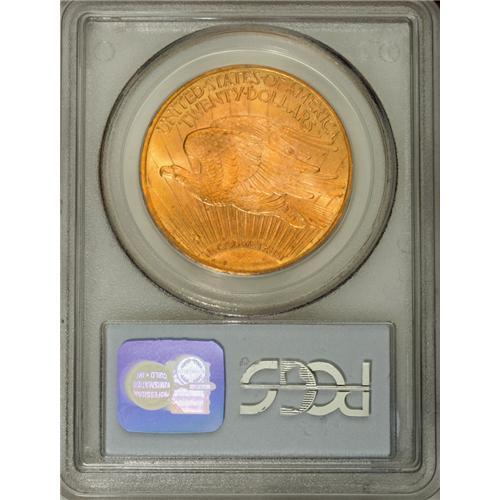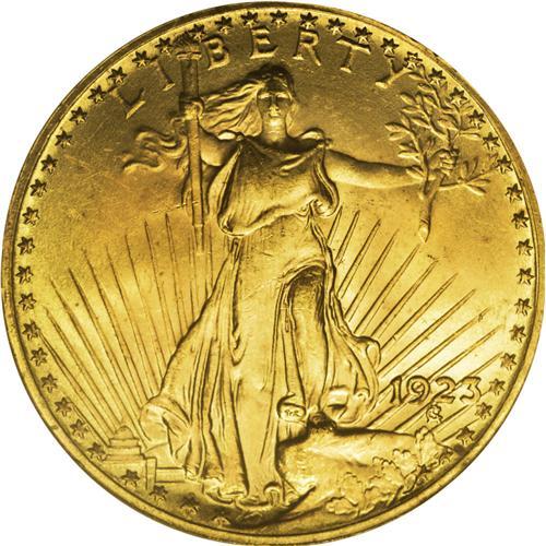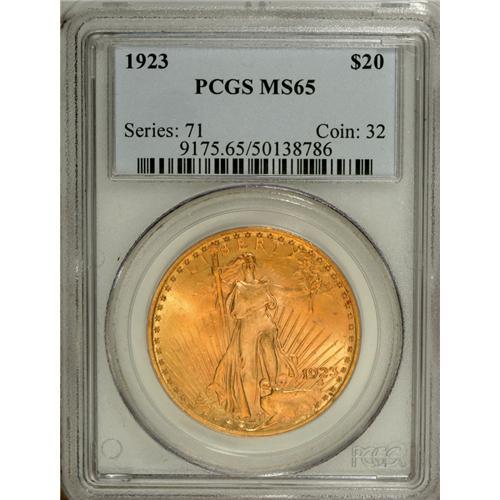 <B>1923 $20 MS65 PCGS.</B></I> The 1923 is considered a "common" date, perhaps not so common as the more typical type issues for the series, even through Gem status. This is a misperception, though, as a number of resubmissions have inflated the perceived population. The present piece is a lustrous peach-gold Gem that has above-average detail and a modest number of marks in the fields. PCGS has certified only three pieces finer (12/06).<BR><BR><b>Shipping:</b> Coin/Currency (<a target="_blank" href="http://www.heritageauctions.com/common/shipping.php">view shipping information</a>)