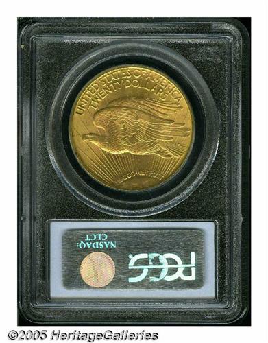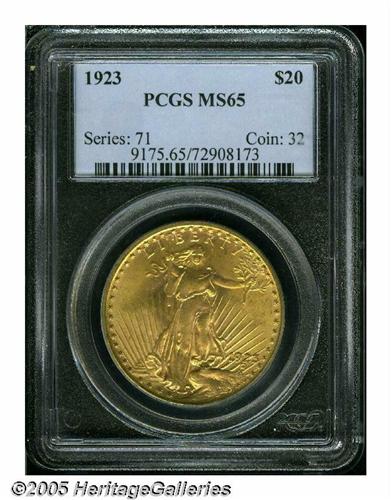 <B>1923<$20> MS65 PCGS.</B></I> The 1923 is similar to the 1922 in terms of high grade rarity, although the edge goes to the former issue at the Gem BU grade level. Free of all but a few wispy bagmarks, this coin is thickly satiny with a rich endowment of reddish-gold color. Both sides present a well balanced, sharply defined appearance. Population: 121 in 65, 2 finer (6/05).
