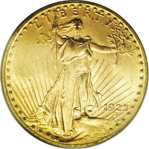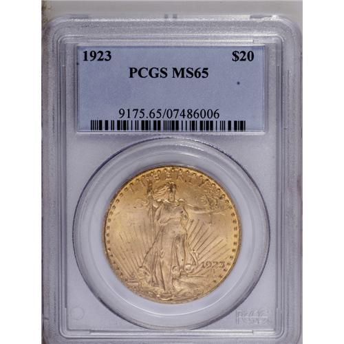 <B>1923<$20> MS65 PCGS.</B></I> The lustrous surfaces are smoky-gold and well struck. A couple of small abrasions on Liberty's face and the last digit in the date are seen under a loupe. Despite the general availability in lower Mint State grades, this issue is extremely elusive at the Gem level. PCGS has graded only three specimens finer, with none at NGC (6/06).