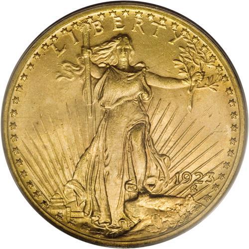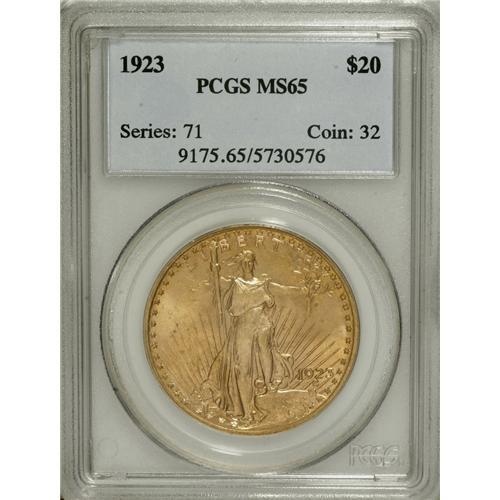 <B>1923 $20 MS65 PCGS.</B></I> This is a beautiful Gem with rich reddish-gold color evenly distributed over both sides. Generally sharp with shimmering surfaces and only a handful of tiny flaws. Challenging to find in Gem, and PCGS has graded only three coins finer (4/07).<BR><BR><b>Shipping:</b> Coins & Currency (<a target="_blank" href="http://www.heritageauctions.com/common/shipping.php">view shipping information</a>)
