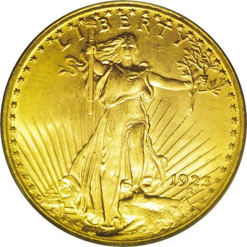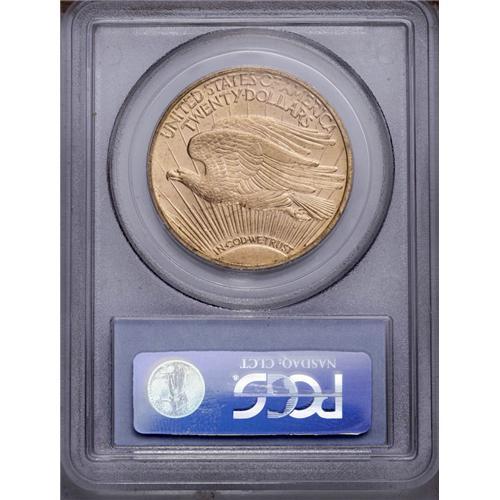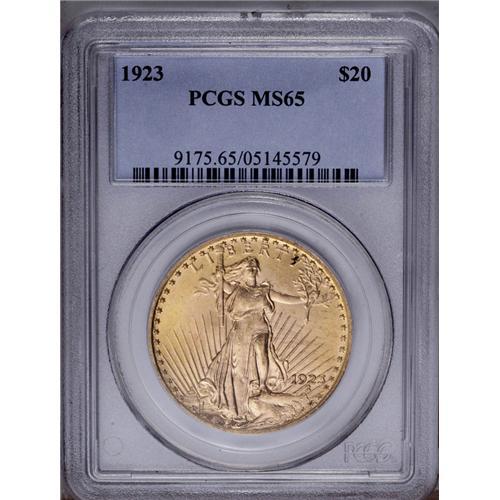 <B>1923<$20> MS65 PCGS.</B></I> While the 1923 is considered to be a "common" date, it is really only deserving of that status in MS63 or lower condition. Near-Gems become more challenging, and MS65 pieces are scarce. The present Gem displays adequately struck motifs, though some softness is apparent on the Capitol building. A few minute marks scattered about are within the parameters of the MS65 grade level. PCGS has certified a mere two coins finer (4/06).