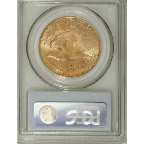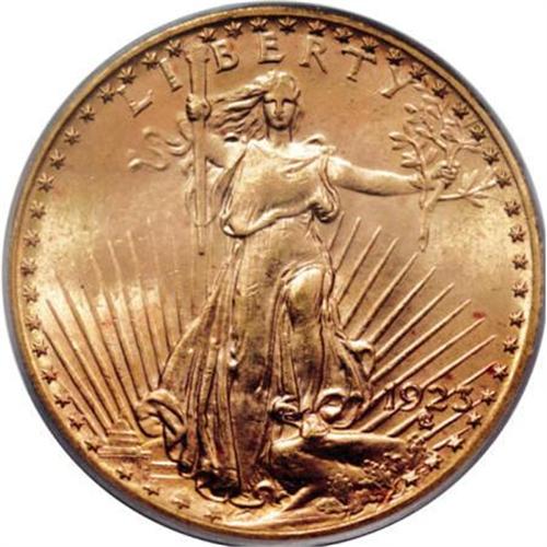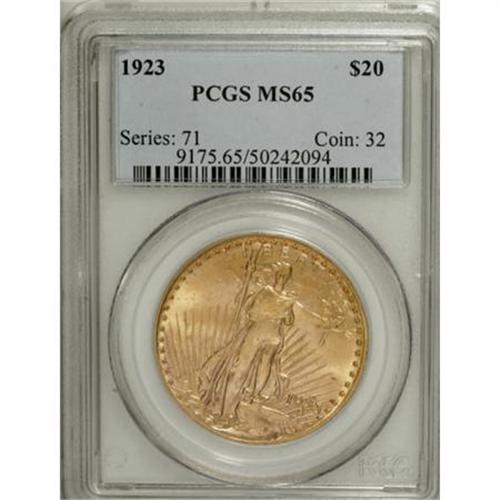 <B>1923 $20 MS65 PCGS.</B></I> An impressive Gem with rich orange-gold luster and scattered darker toning spots on each side. Both sides have frosty luster and excellent eye appeal. An easy date to locate in Gem quality, but not any finer. Just three better ones have been certified by PCGS, and only one by NGC (8/07).<BR><BR><B>Coin Engraver:</B> Augustus Saint-Gaudens<BR><BR><b>Shipping:</b> Coins & Currency (<a target="_blank" href="http://www.heritageauctions.com/common/shipping.php">view shipping information</a>)