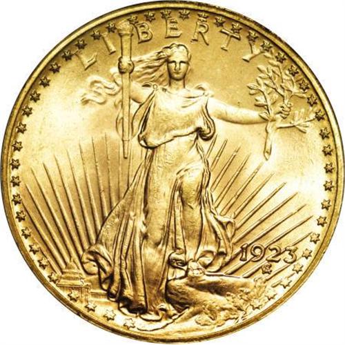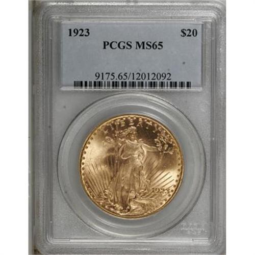 <B>1923 $20 MS65 PCGS.</B></I> The Philadelphia Saint-Gaudens issues from 1922 through 1928 are the best type examples of the series, along with the well-produced 1923-D. This 1923 Philly piece boasts charming, frosty orange-gold surfaces with good eye appeal. PCGS has graded three pieces finer (12/07). <BR><BR><B>Coin Engraver:</B> Augustus Saint-Gaudens<BR><BR><b>Shipping:</b> Coins & Currency (<a target="_blank" href="http://www.heritageauctions.com/common/shipping.php">view shipping information</a>)