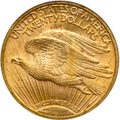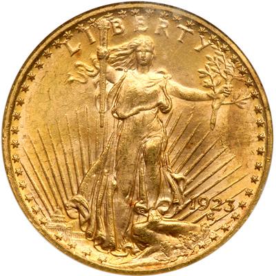1923 $20. NGC graded MS-63. A couple copper spots exist on both sides. Appealing golden orange toning.