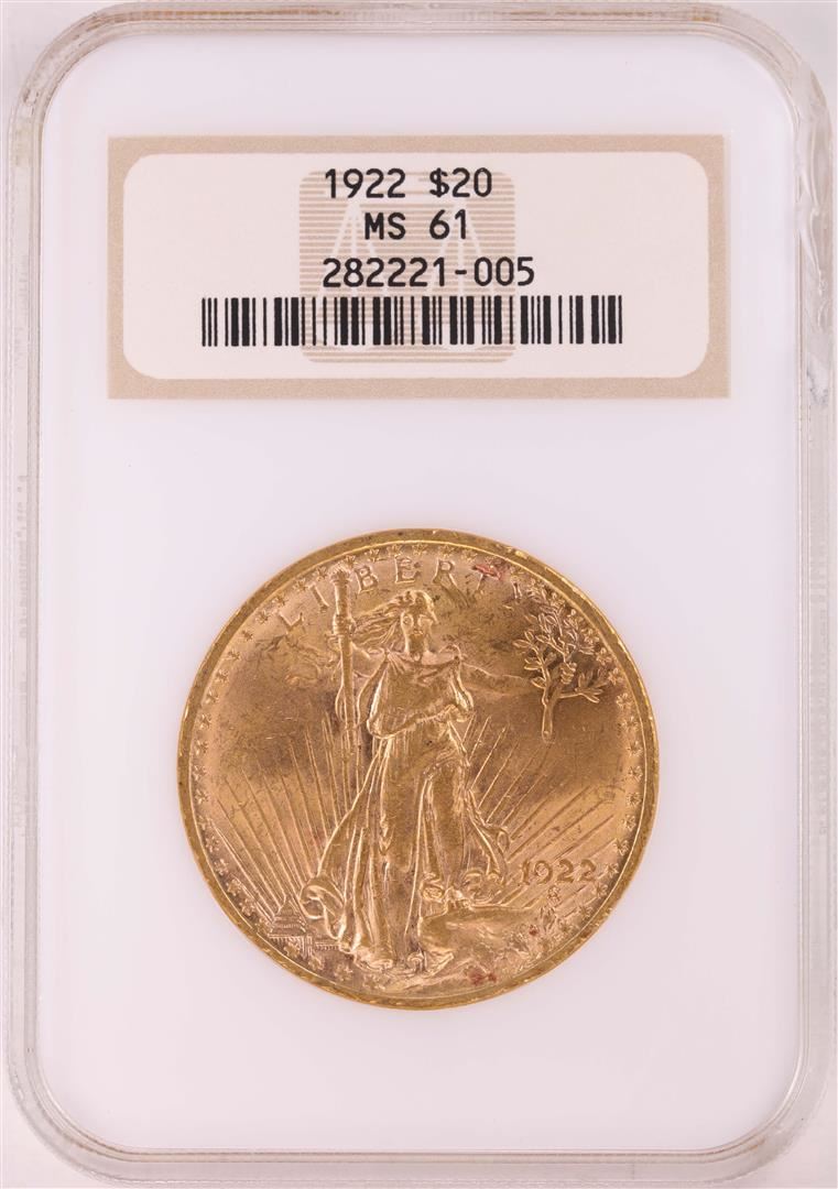 One 1923 $20 St. Gaudens Double Eagle Gold Coin NGC MS61 - Chipped Slab. NGC Certified.