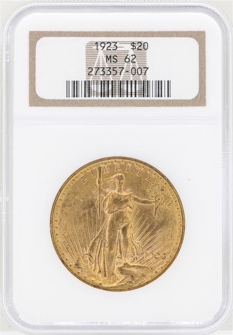 One 1923 $20 St. Gaudens Double Eagle Gold Coin NGC MS62. NGC Certified.