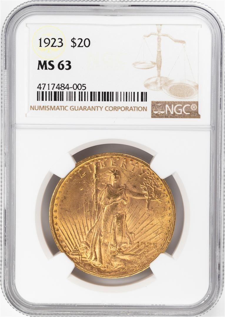 One 1923 $20 St. Gaudens Double Eagle Gold Coin NGC MS63. NGC Certified.