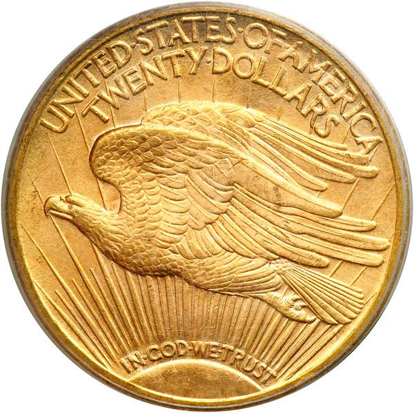 1923 $20 St. Gaudens. PCGS graded MS-65. Lovely natural golden toning with an aura of lovely reddish pink around Liberty. In a new shield holder. A common date in lower grades and quite scarce as a gem, this one being a blazing gem by all measures. Pop 362; 2 in 66. (PCGS # 9175) .