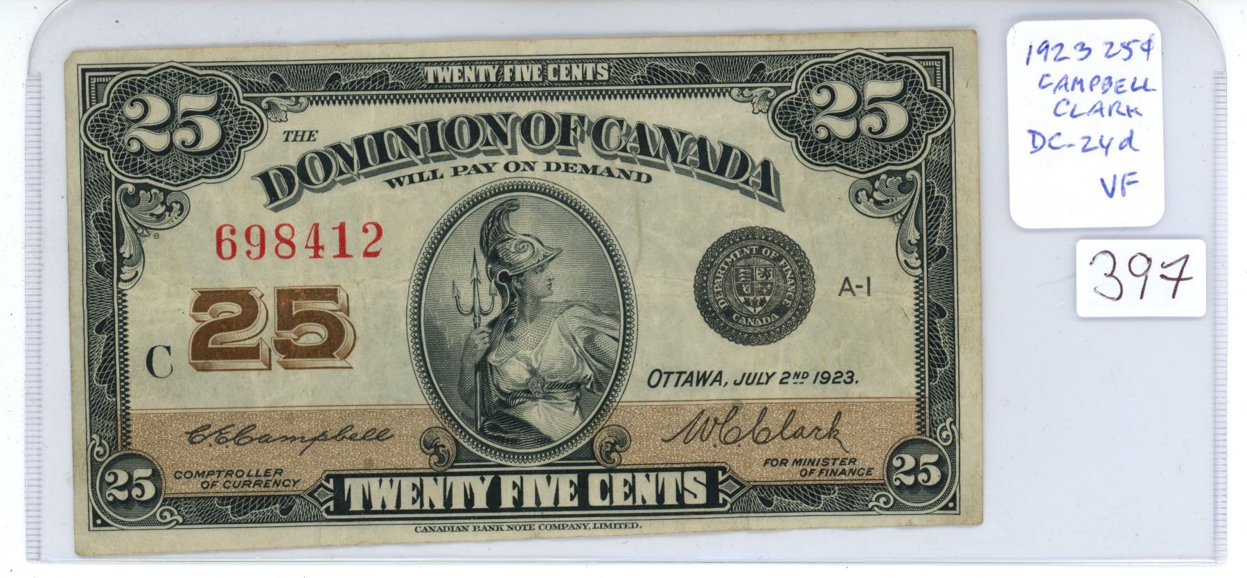 1923 25 Cents Shinplaster. Campbell-Clark signatures. DC-24d. VF-20.