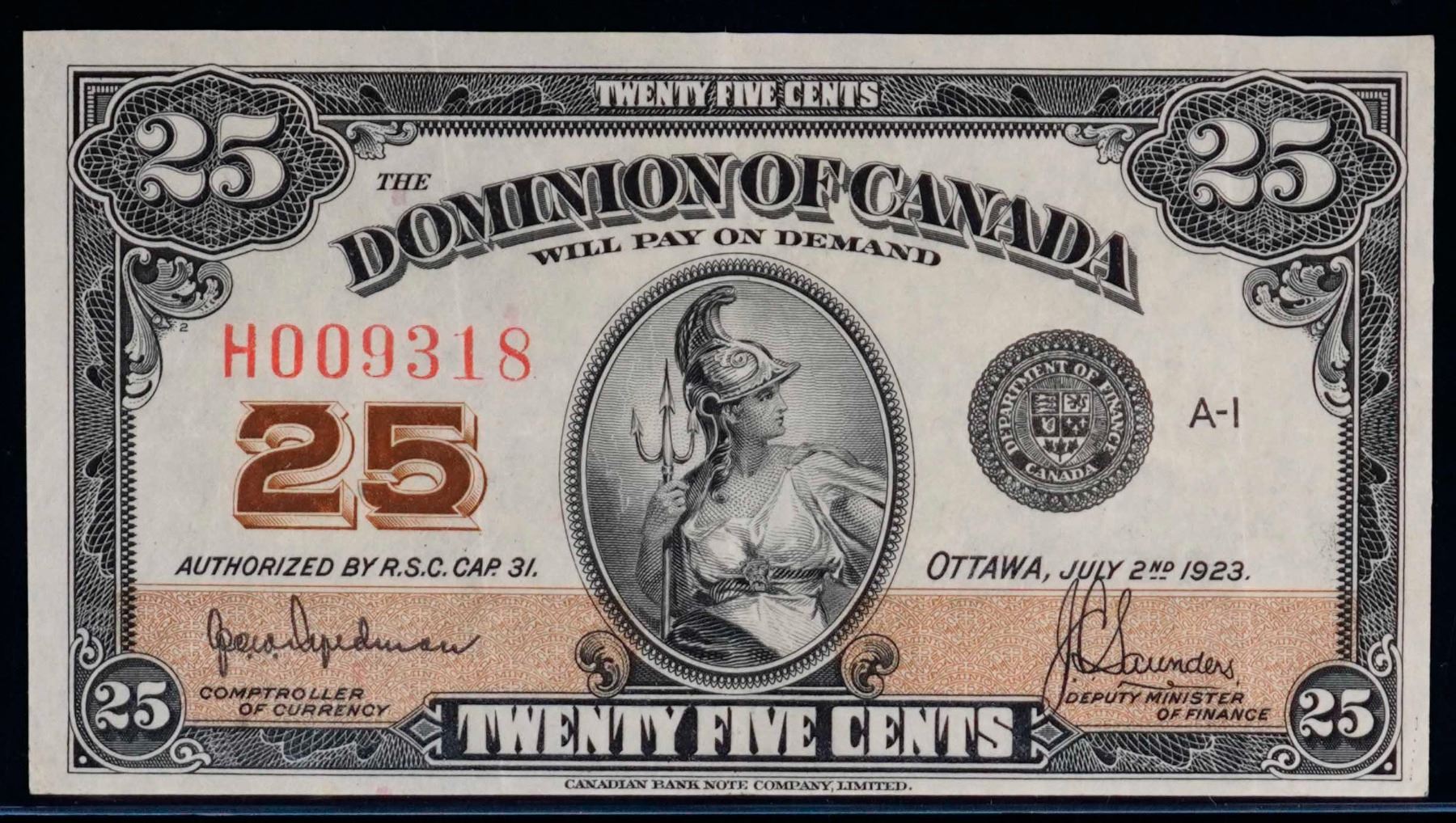 1923 25 Cents - Shinplaster DC-24a #H009318 "Auth - Hyndman" VF-EF Bright example.