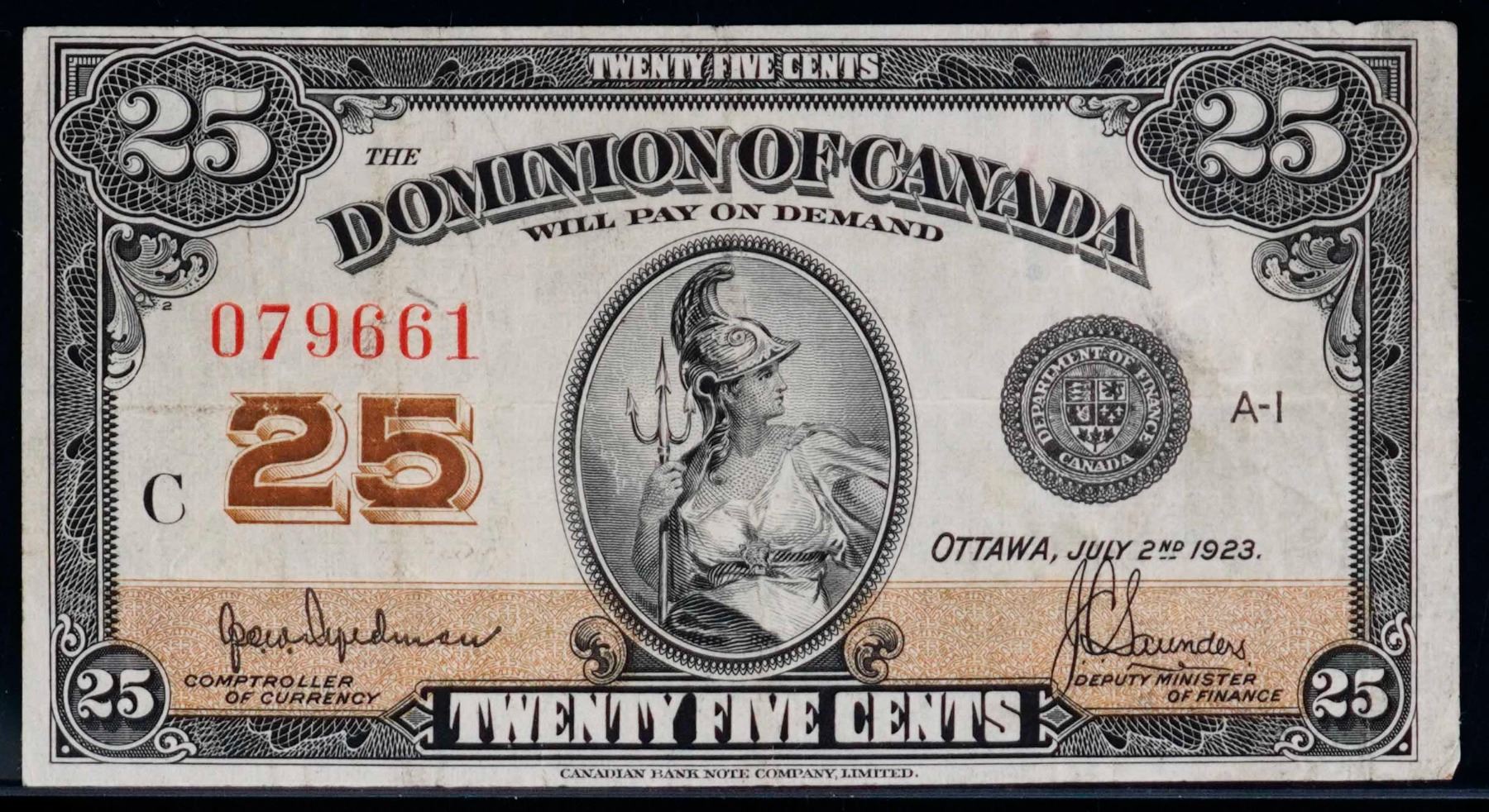 1923 25 Cents - Shinplaster DC-24b #079661 "Letter C - Hyndman" VF+Bright example.