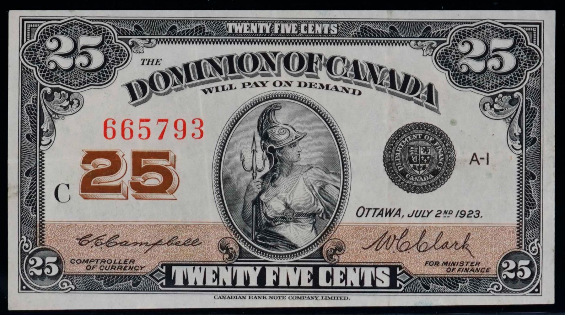 1923 25 Cents - Shinplaster DC-24d #665793 "Letter C - Campbell" VF-EF, Bright example.