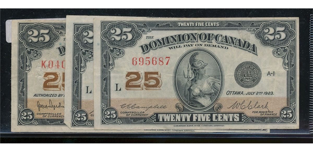 1923 25¢ DC-24 Lot; includes 1 of each signature , 24a, 24b & 24c VF or better.