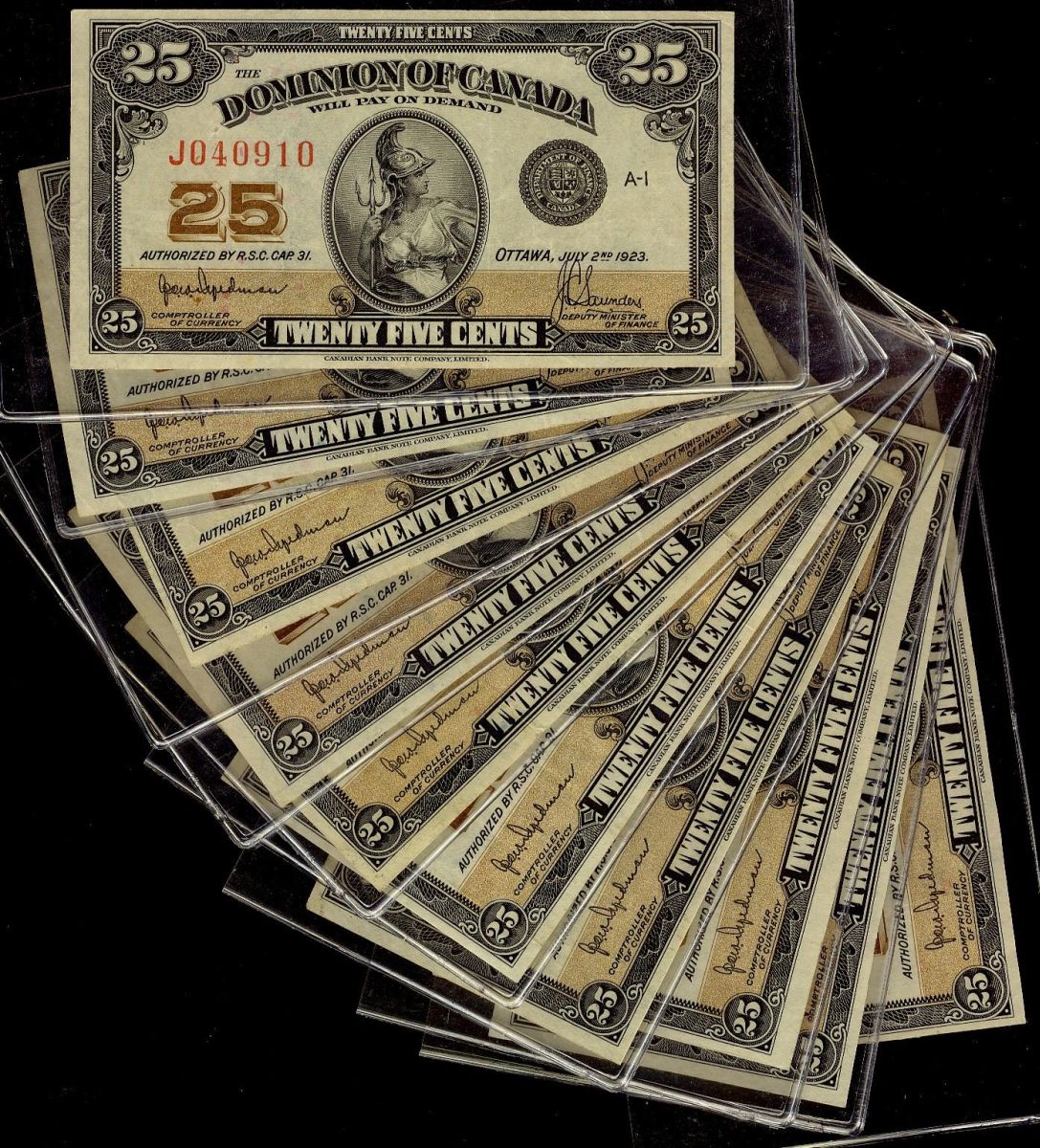 1923 25¢ DC-24a. Complete set by Check Letter, includes 10 notes. VF to EF.