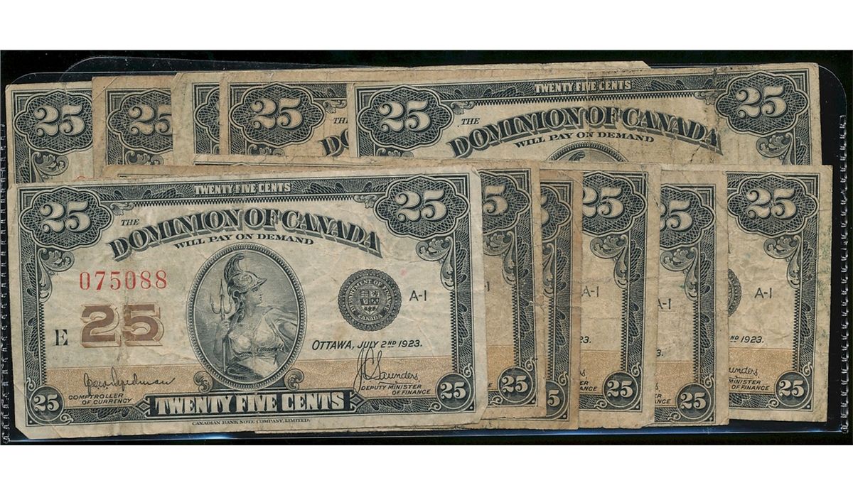 1923 25¢ DC-24a & DC-24b. Lot of 11 notes VG to Fine.