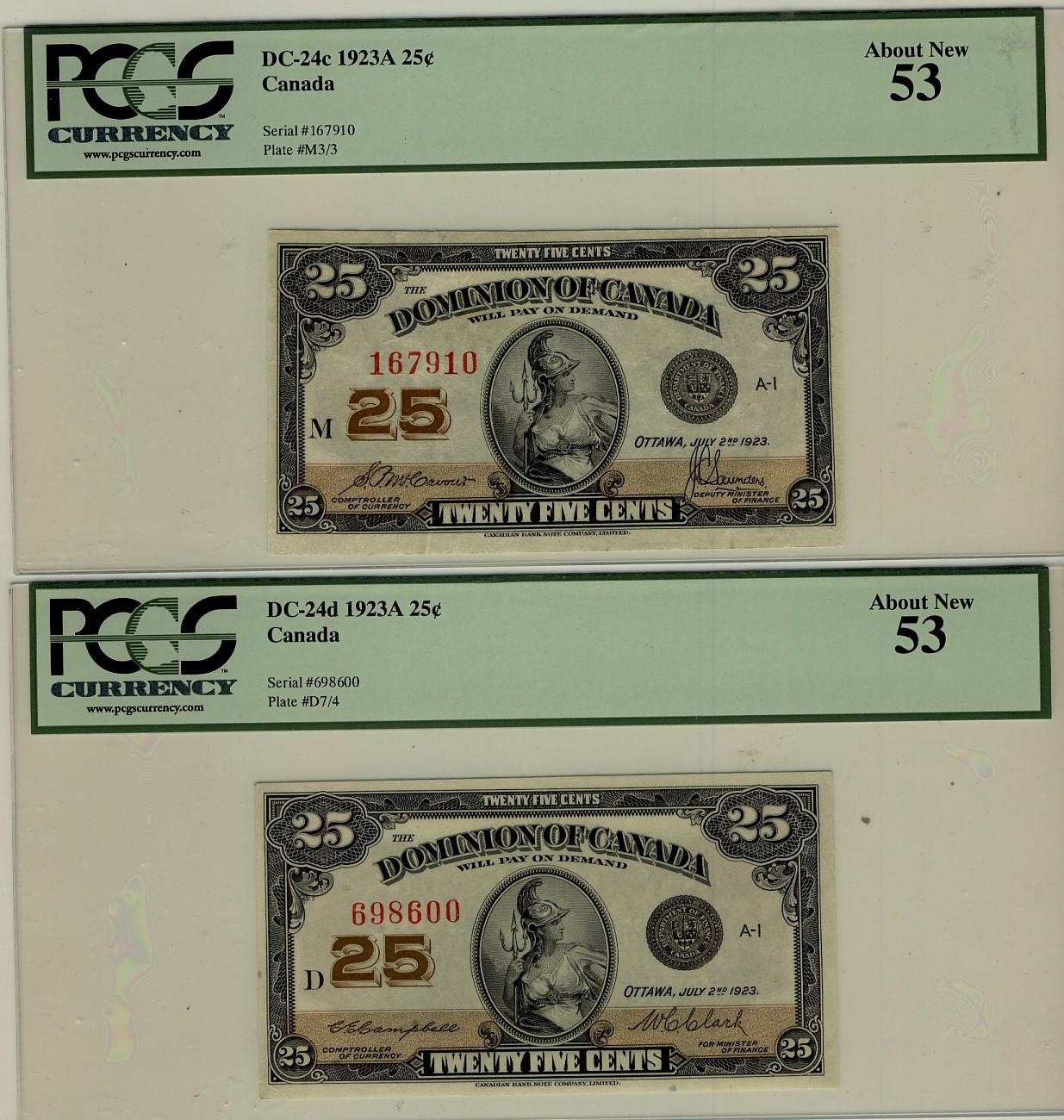 1923 25¢ DC-24c #167910, DC-24d #698600 both PCGS AU53