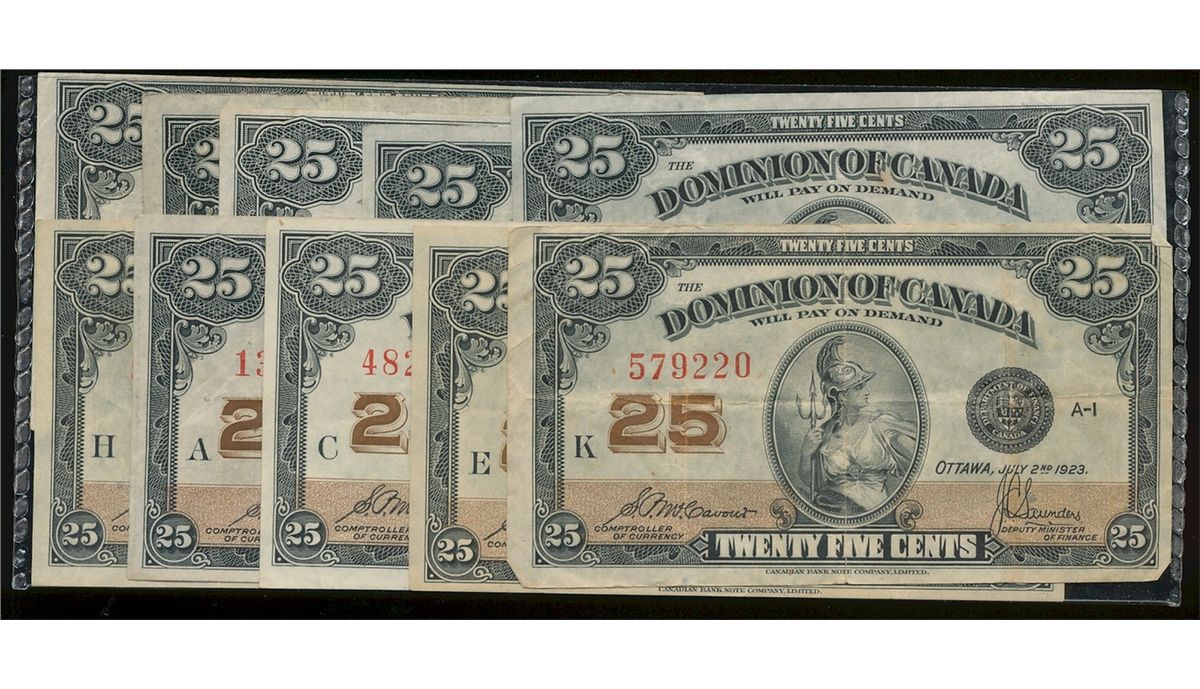 1923 25¢ DC-24c. Lot of 10 notes VF to EF.