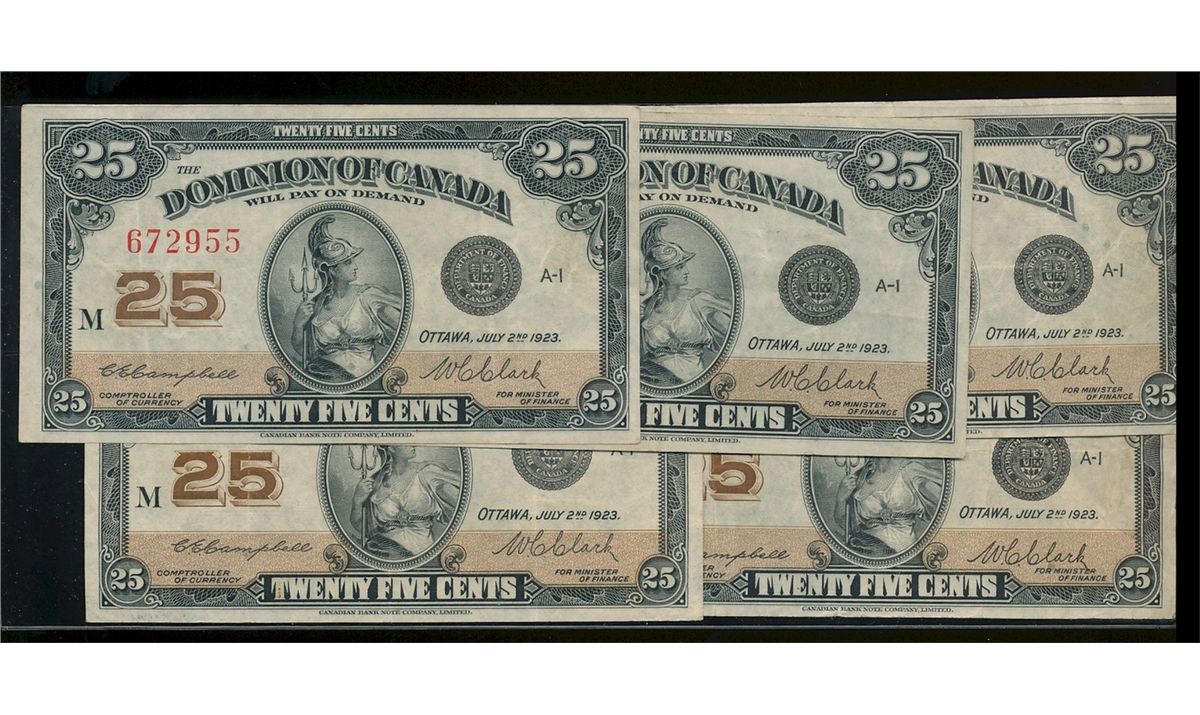 1923 25¢ DC-24d. Lot of 5 notes VF to EF.