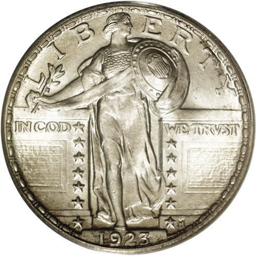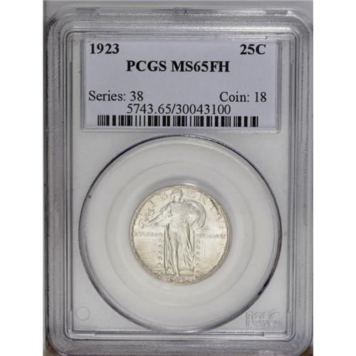 <B>1923<25C> MS65 Full Head PCGS.</B></I> A visually arresting coin, the satiny surfaces are highly lustrous and very lightly toned. The only mentionable surface blemishes are a pair of minor nicks that reside on the lower half of Liberty's left (facing) leg. A seemingly high-end Gem, with splendid eye appeal. Population: 29 in 65, 26 finer (3/06).