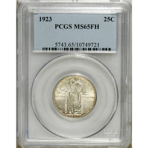 <B>1923 25C MS65 Full Head PCGS.</B></I> A well struck Gem with unusual sharpness on Liberty's shield rivets and waist. The head is full, and any incompleteness of strike is limited to the date and the tops of UNITED STATES. This lustrous beauty has pale gold and sky-blue toning, but is otherwise virtually as it left the Mint more than 80 years ago. Population: 32 in 65, 26 finer (1/07).<BR><BR><b>Shipping:</b> Coins & Currency (<a target="_blank" href="http://www.heritageauctions.com/common/shipping.php">view shipping information</a>)