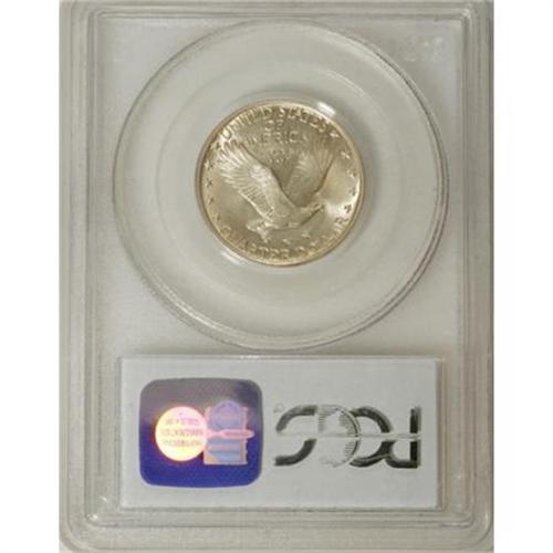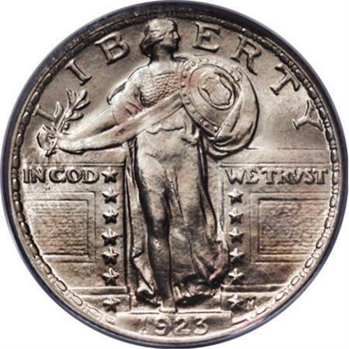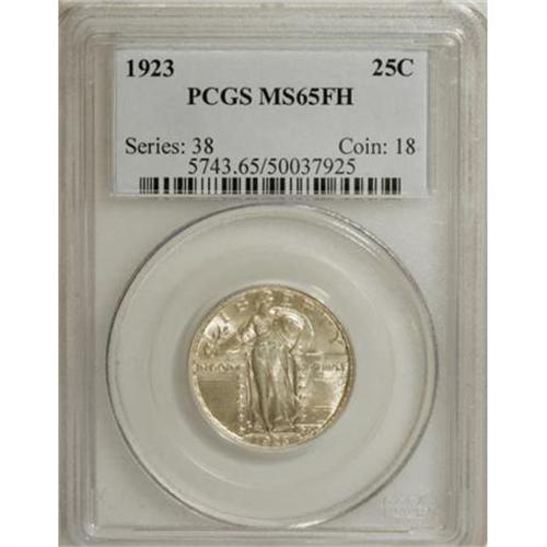 <B>1923 25C MS65 Full Head PCGS.</B></I> Glints of lilac and aqua grace the surfaces of this frosty and still mostly untoned coin. At first glance this piece appears to be undergraded, but close perusal with a loupe reveals a few light, undistracting contact marks away from the prime focal areas that appear to limit the grade. The appeal is nonetheless outstanding, and the piece appears high-end for a Gem grade. Well struck and delightful. Population: 32 in 65 Full Head, 26 finer (7/07).<BR><BR><B>Coin Engraver:</B> Hermon A. MacNeil<BR><BR><b>Shipping:</b> Coins & Currency (<a target="_blank" href="http://www.heritageauctions.com/common/shipping.php">view shipping information</a>\)