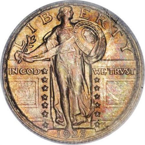 <B>1923 25C MS65 Full Head PCGS.</B></I> A melange of crimson, yellow-gold, mint-green, lavender, blue-gray, and sky-blue patina bathes the radiantly lustrous surfaces of this attractive Gem. A powerful strike complements the gorgeous toning, and includes sharp definition on the chain mail, rivets, date, and eagle's plumage, in addition to the Full Head. Impeccably preserved surfaces further enhance the eye appeal. Population: 33 in 65 Full Head, 25 finer (1/08).<BR><BR><B>Coin Engraver:</B> Hermon A. MacNeil<BR><BR><b>Shipping:</b> Coins & Currency (<a target="_blank" href="http://www.heritageauctions.com/common/shipping.php">view shipping information</a>)