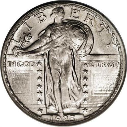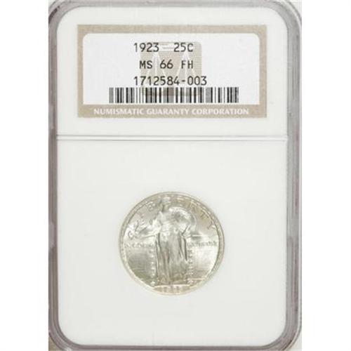 <B>1923 25C MS66 Full Head NGC.</B></I> Both sides of this remarkable Premium Gem are awash in frosty luster and devoid of toning. The strike is amazing, displaying fullness in the chain mail, rivets, and stripes of the inner shield, as well as Liberty's head. A few trivial obverse handling marks may well preclude an even higher grade. Census: 13 in 66 Full Head, 2 finer (11/07).<BR><I>From The Hoffy Collection, NGC's #3 Registry Collection of Standing Liberty Quarters.</B></I><BR><BR><B>Coin Engraver:</B> Hermon A. MacNeil<BR><BR><b>Shipping:</b> Coins & Currency (<a target="_blank" href="http://www.heritageauctions.com/common/shipping.php">view shipping information</a>)