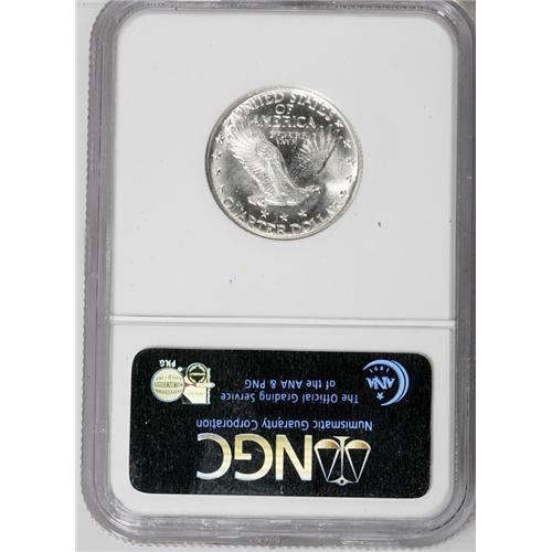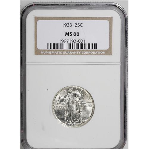 <B>1923<25C> MS66 NGC.</B></I> Scarcely toned in ice-blue and quite lustrous. Almost every detail is crisply struck, though the usual trouble spots show a bit of softness.