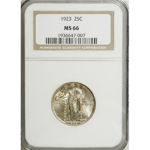 <B>1923 25C MS66 NGC.</B></I> Wisps of gold-tan and green patination adhere to radiantly lustrous surfaces. While not quite a full head, the strike is generally exquisite. All of the chain mail and all rivets are sharp. Well preserved throughout.<BR><BR><b>Shipping:</b> Coins & Currency (<a target="_blank" href="http://www.heritageauctions.com/common/shipping.php">view shipping information</a>)
