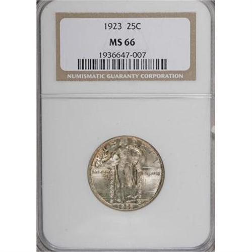 <B>1923 25C MS66 NGC.</B></I> Wisps of gold-tan and green patination adhere to radiantly lustrous surfaces. While not quite a full head, the strike is generally exquisite. Sharply struck and well-preserved throughout.<BR><BR><B>Coin Engraver:</B> Hermon A. MacNeil<BR><BR><b>Shipping:</b> Coins & Currency (<a target="_blank" href="http://www.heritageauctions.com/common/shipping.php">view shipping information</a>)