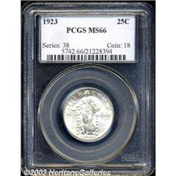 1923 25C MS66 PCGS. This Choice Gem piece has a brilliant white, untoned obverse with a lustrous reverse that has a hint of creamy rose tone that begins to form over portions of it. Sharply struck and with an exceptionally mark-free right leg this example has almost no contact marks. Important notice: Heritage usually auctions material at the rate of 200-250 lots per hour. On some occasions eBay Live bid software or the Internet may not be able to keep up with the pace of the auction. We recommend placing a realistic absentee bid now as insurance to avoid disappointment. Occasionally the auctioneer may eliminate or reject an eBay Live bid, and the auctioneer may also reopen a lot after the close of the eBay live bidding (usually because we missed an audience bid), and may reject your bid even if it shows you as the winning bidder. By bidding via eBay Live, you agree that Heritage may award the lot to another bidder at its sole discretion under the circumstances described above or any other reasonable circumstances. Also please note that all Heritage lots purchased through eBay Live carry a 20% Buyer's Premium. Please make sure you read the Terms and Conditions before you bid.