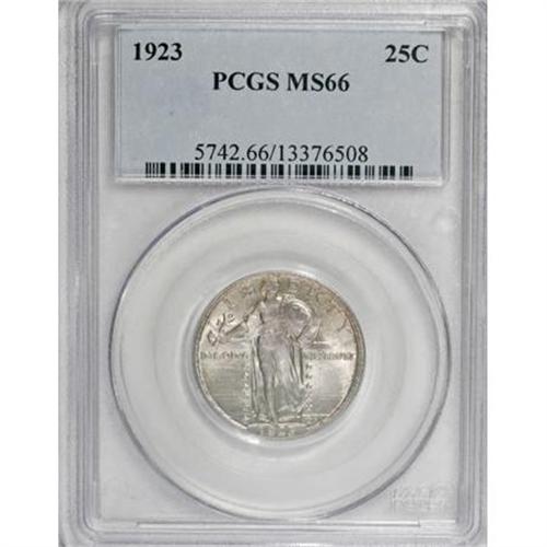 <B>1923 25C MS66 PCGS.</B></I> PCGS Population (192/15). NGC Census: (166/43). Mintage: 9,716,000. Numismedia Wsl. Price for NGC/PCGS coin in MS66: $675. (#5742)<BR><BR><B>Coin Engraver:</B> Hermon A. MacNeil<BR><BR><b>Shipping:</b> Coins & Currency (<a target="_blank" href="http://www.heritageauctions.com/common/shipping.php">view shipping information</a>)