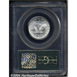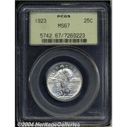 <B>1923<25C> MS67 PCGS.</B></I> A brilliant Superb Gem that has booming luster and outstanding preservation. Crisply struck on Liberty's waist and shield, as all the rivets are fully outlined although two are in low relief. The sprigs on Liberty's head are not defined, but the ear hole and profile are bold. Not a rare date within the Standing Liberty series, but few survivors can aspire to this lofty grade. Population: 15 in 67, 0 finer (3/04). <BR><BR><B>Important notice:</B> Heritage usually auctions material at the rate of 200-250 lots per hour. On some occasions eBay Live bid software or the Internet may not be able to keep up with the pace of the auction. We recommend placing a realistic absentee bid now as insurance to avoid disappointment. Occasionally the auctioneer may eliminate or reject an eBay Live bid, and the auctioneer may also reopen a lot after the close of the eBay live bidding (usually because we missed an audience bid), and may reject your bid even if it shows you as the winning bidder. By bidding via eBay Live, you agree that Heritage may award the lot to another bidder at its sole discretion under the circumstances described above or any other reasonable circumstances. Since eBay bids are not shown to us until we open the lot on the floor, we treat those bids just like floor bids. In most cases the floor responds before the eBay bid is presented to us, due to Internet lag time, so for consistency we have made it a policy that floor bids are always considered first over tie eBay live bids. Also please note that all Heritage lots purchased through eBay Live carry a 20% Buyer's Premium. Please make sure you read the Terms and Conditions before you bid. </span></font></tr></table></td></tr></table>