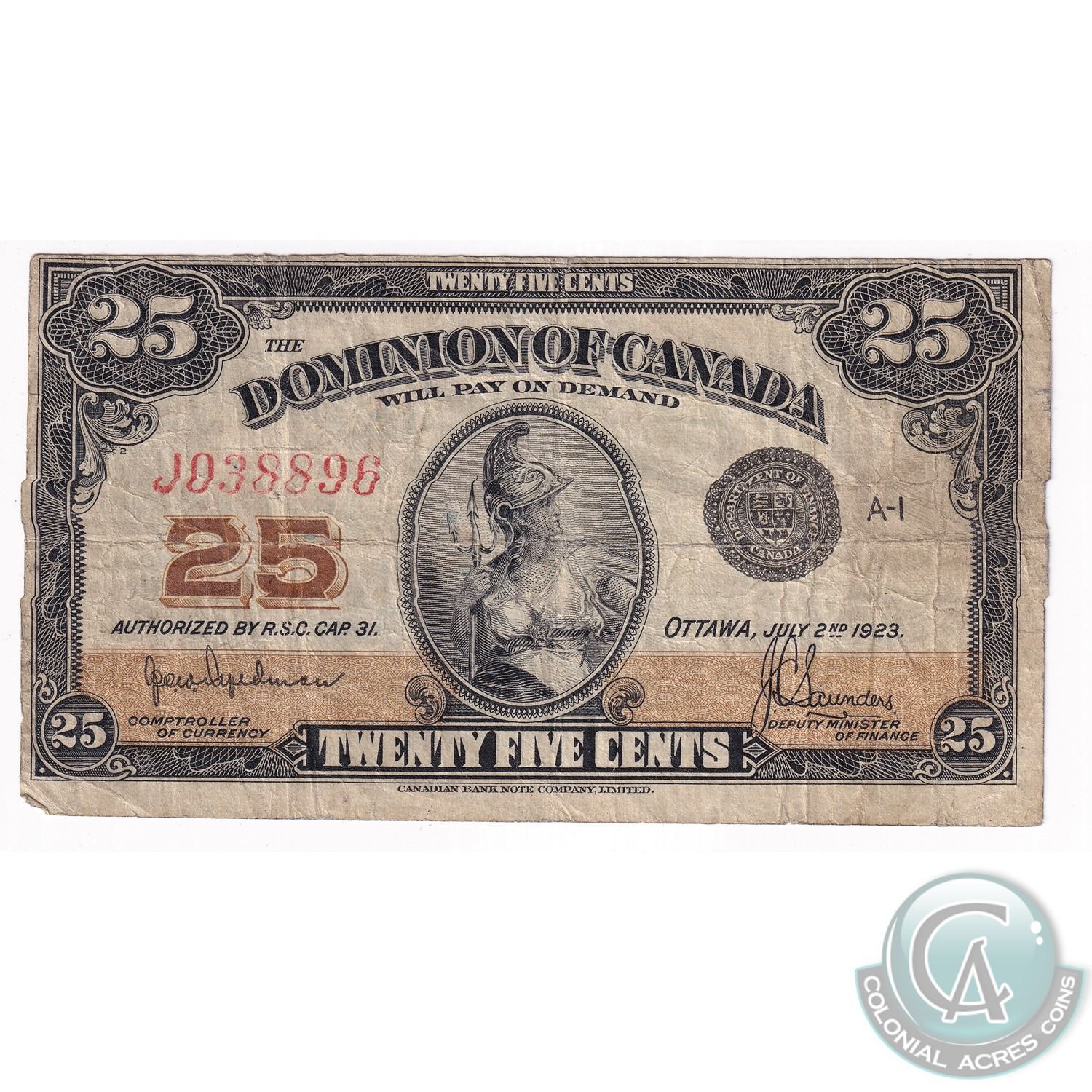 1923 25c BC-24a, Dominion of Canada, Authorized, F (Holes)