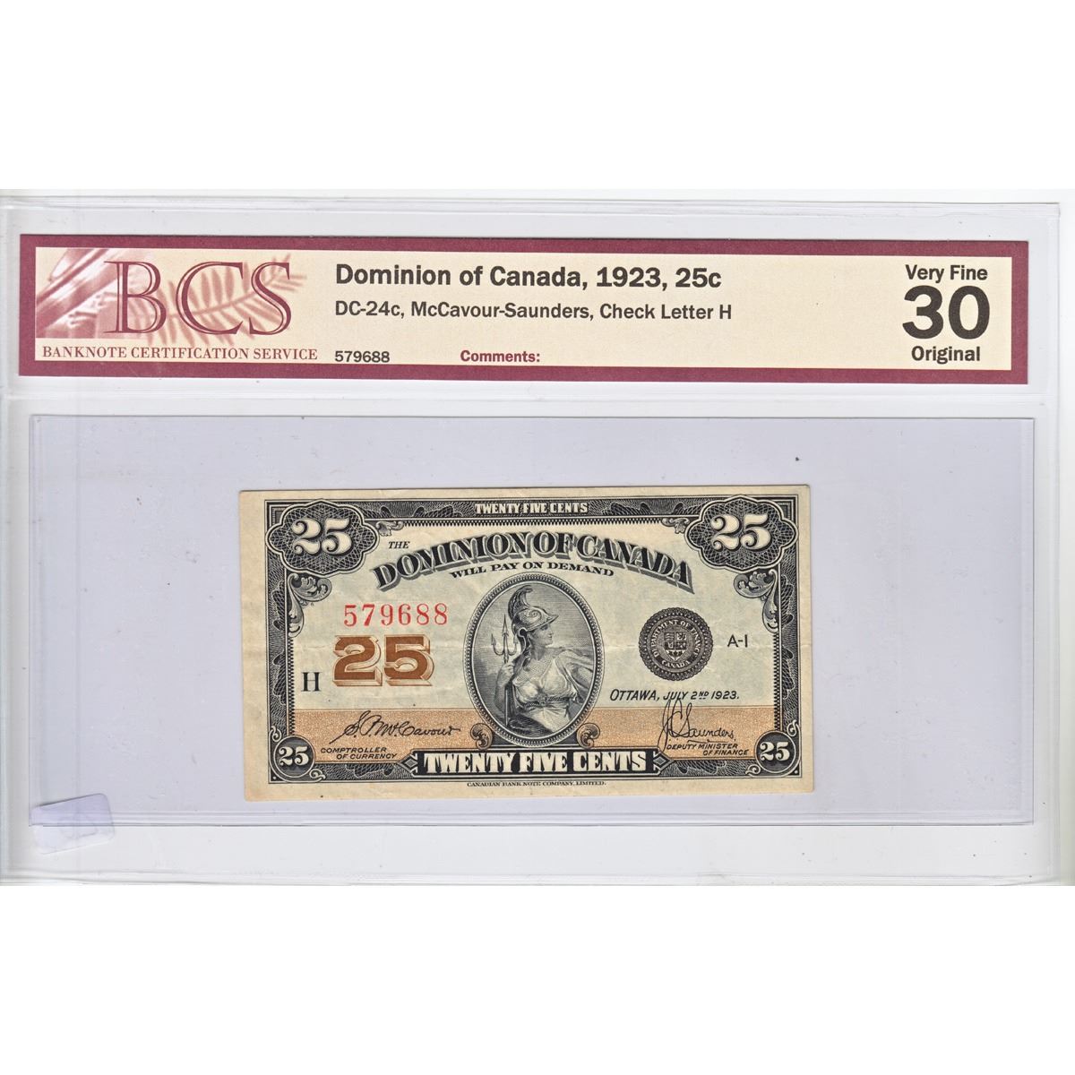 1923 25c Note from the Dominion of Canada; cat code DC-24c, McCavour-Saunders signatures, BCS Certified VF-30, Original. Buyers Premium will be added on all items as per our terms of sale. We accept Paypal, Credit Card, E-Transfer Payments, Cheque or Money Orders (there is an additional 3% fee for using Paypal or Credit Card). All invoices will be emailed immediately following the auction, please contact us if you would like to pay by credit card or receive a new revised lower total for mailing in payment or sending an e-transfer (3% discount). All Items Are Sold "AS IS", no returns