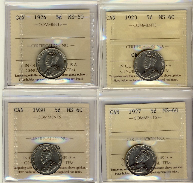 1923 5¢, 1924, 1927 & 1930 ICCS MS60. Lot of 4 coins.
