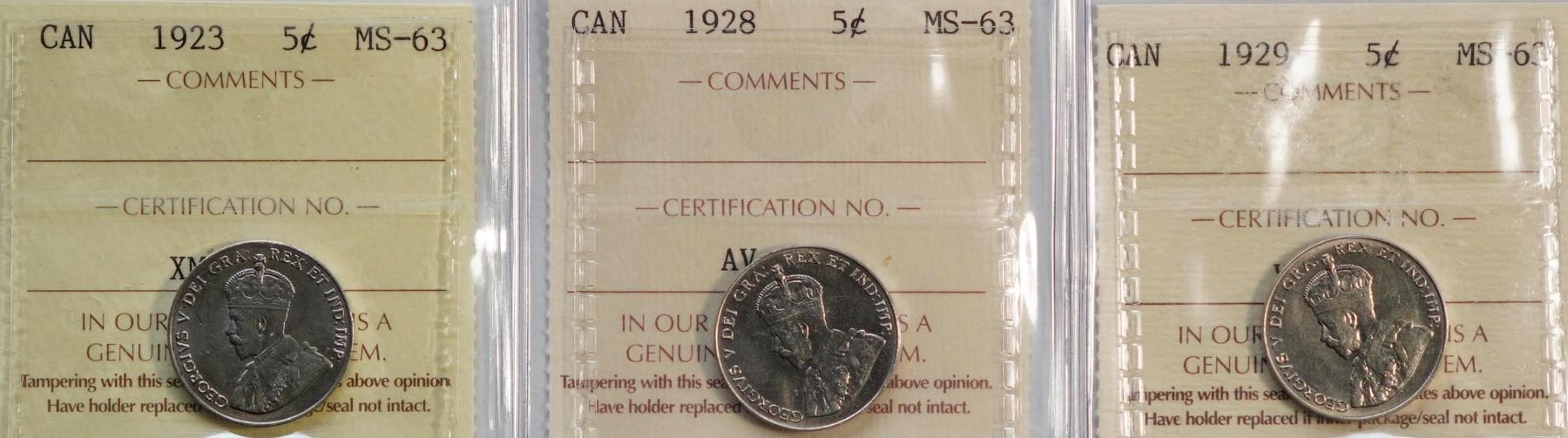 1923 5¢, 1928, and 1929, all ICCS Choice Mint State-63, lot of 3 coins.